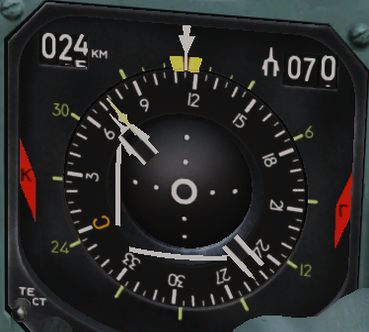 6. Обратный конец стрелки кур- азимут самолета относительно РМ.