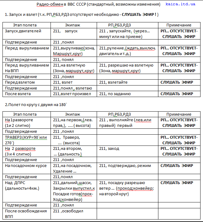 Настройки SRS, Таблица радиообмена